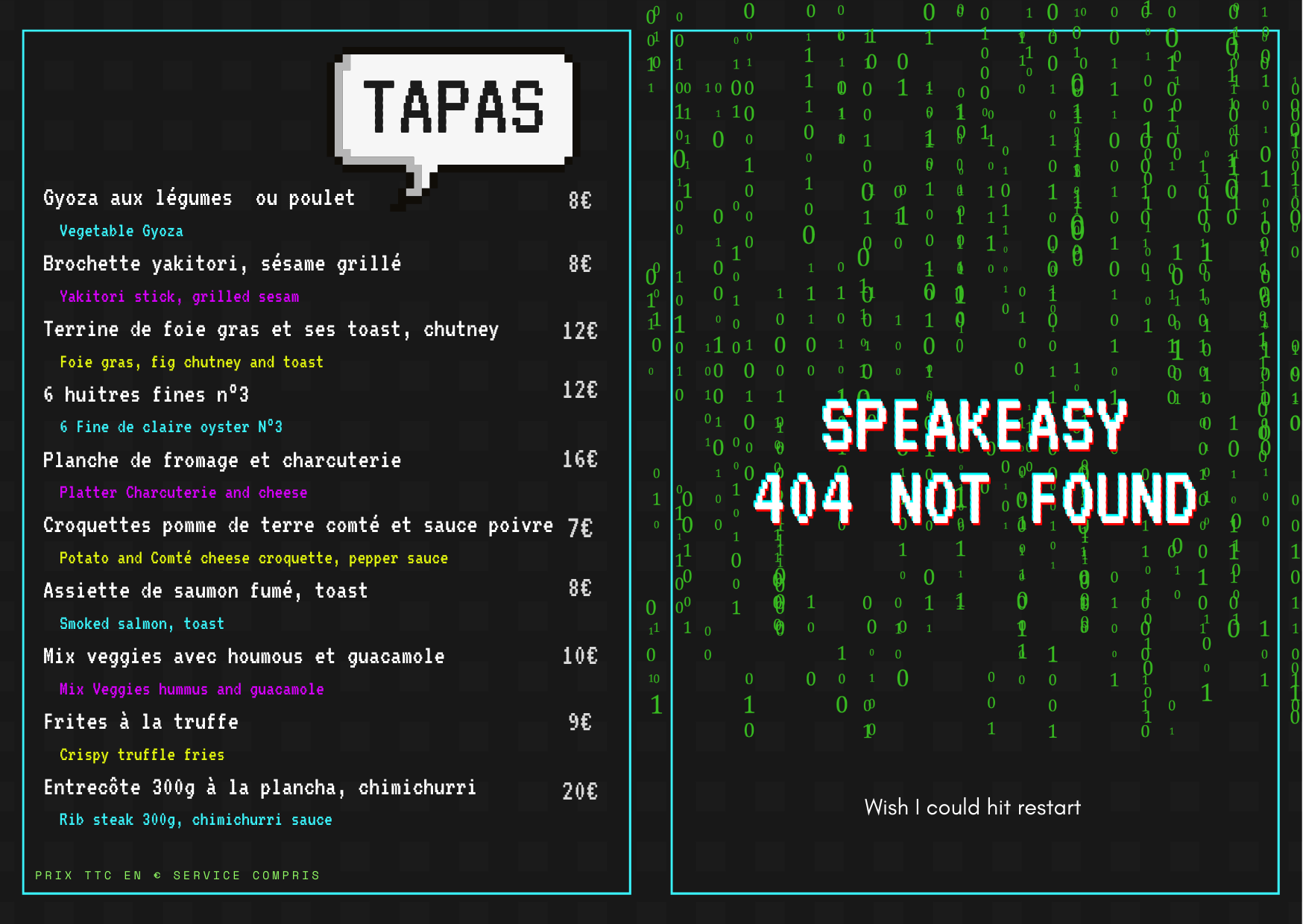 Ce qui a commencé comme une blague de programmeur est devenu le speakeasy le plus exclusif de Paris. Nous servons des cocktails artisanaux avec une touche numérique, où chaque boisson raconte une histoire de code, de connexion et des belles erreurs qui nous rendent humains.